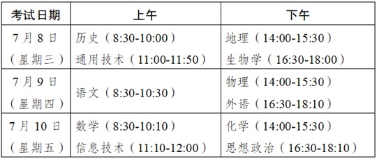 语文、数学、外语、思想政治、历史、地理、物理、化学、生物学、信息技术和通用技术共11个科目。考试时间为7月8—10日,具体安排如下: